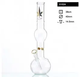 Bongo GOLD LINE o wysokości 39 cm to pozycja, która przyciąga uwagę swoim subtelnym, ale wyjątkowym wyglądem. Wykonane z przezroczystego szkła borokrzemowego, zachwyca eleganckim nadrukiem liścia konopi w odcieniach czerni i złota oraz delikatnymi złotymi akcentami na cybuchu i szyjce. To model stworzony z myślą o użytkownikach, którzy cenią nie tylko funkcjonalność, ale również estetykę i detal.