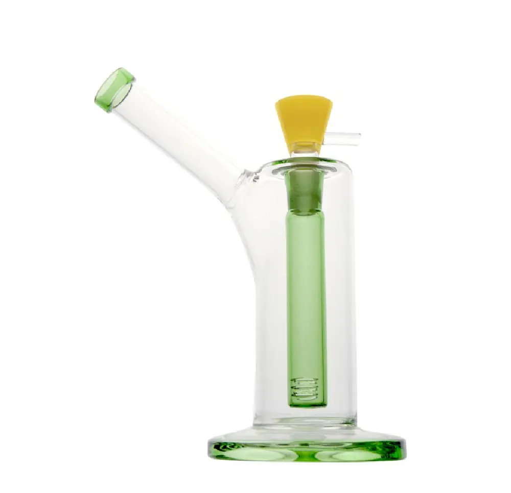 Bongo szklane Mini 17 cm wyróżnia się prostą, cylindryczną formą z subtelnymi zielonymi i żółtymi elementami, które nadają mu nowoczesny charakter. Szklane wykonanie pozwala obserwować przepływ dymu i działanie perkolatora, co zwiększa atrakcyjność wizualną podczas użytkowania. To bongo nie tylko działa skutecznie, ale też prezentuje się estetycznie i nowocześnie.