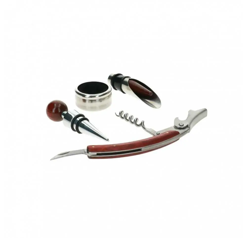 Akcesoria do wina wykonano z połączenia stali nierdzewnej i elementów drewnianych, co nadaje im elegancki wygląd i trwałość. Każdy element zestawu został zaprojektowany tak, by zapewniać maksymalną wygodę użytkowania. Korkociąg z otwieraczem umożliwia szybkie i bezpieczne otwarcie butelki, a nalewak ułatwia precyzyjne nalewanie bez rozlewania.