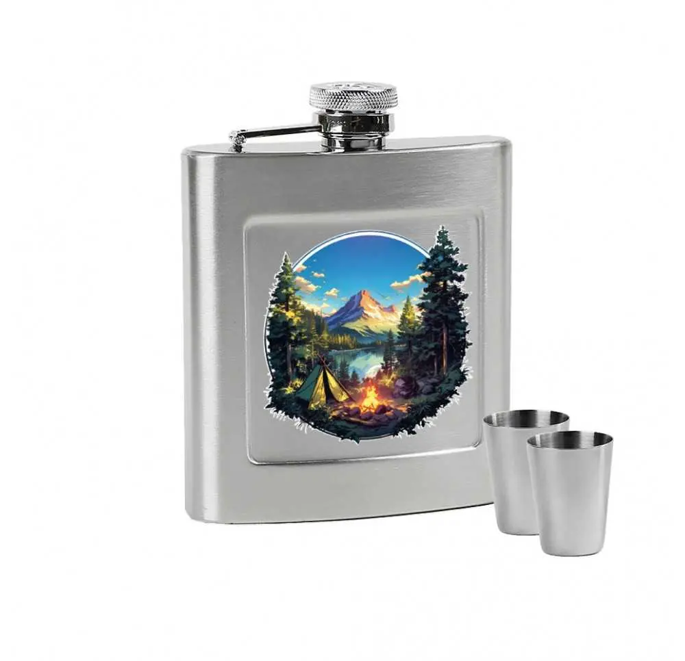 Grafika na piersiówce przenosi Cię w samo serce lasu, gdzie nad brzegiem jeziora stoi rozstawiony namiot, a w jego pobliżu płonie ognisko. W tle widnieją ośnieżone szczyty i bezchmurne niebo, a całość zamknięta jest w efektownej ramce. Ten krajobraz symbolizuje spokój, reset i oddech od codziennego zgiełku. Idealny dla podróżników, miłośników survivalu i fanów natury.