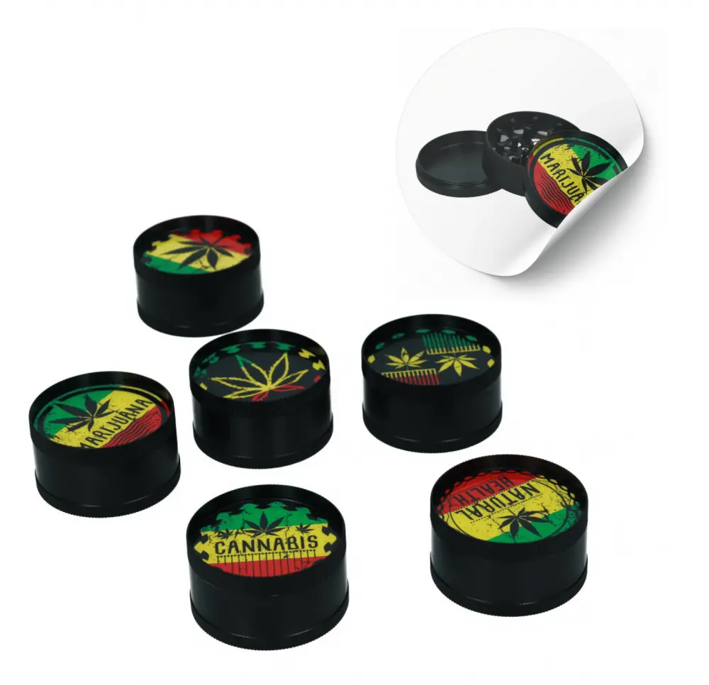 Górna część młynka została ozdobiona unikalnymi grafikami w kolorach rasta. Każdy egzemplarz wyróżnia się indywidualnym stylem i przyciąga wzrok. Czarny metal tworzy eleganckie tło, które podkreśla intensywność kolorów i nadaje młynkowi nowoczesny charakter.