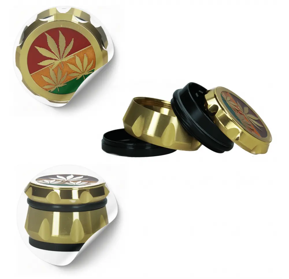 Golden wyróżnia się unikalnym wzornictwem – złote elementy połączone z detalami w odcieniach czerwieni i zieleni nadają mu charakteru inspirowanego kulturą konopi. Metalowa obudowa jest odporna na zarysowania, a ergonomiczny kształt ułatwia trzymanie młynka w dłoni. Jego średnica 55 mm sprawia, że można w nim szybko i sprawnie przygotować większe ilości suszu, co czyni go idealnym zarówno do codziennego, jak i okazjonalnego użytkowania.