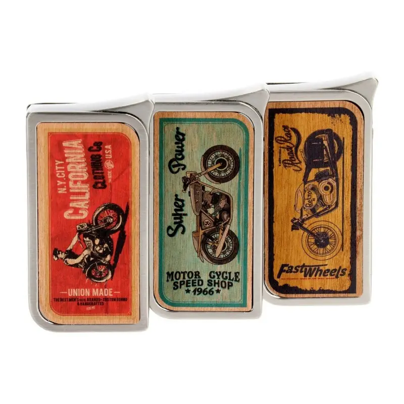 Elegancka zapalniczka piezoelektryczna "Doming Retro Bikes" w złotym kolorze o wysokości 6 cm z fantastycznym nadrukiem na drewnianym elemencie zapalniczki. Zapalniczka z regulacją wysokości płomienia oraz możliwością ponownego naładowania wykonana jest z twardego metalu.