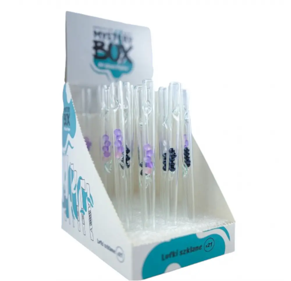 Ten praktyczny BOX zawiera aż 21 sztuk funkcjonalnych rurek szklanych, które zachwycają nie tylko designem, ale też właściwościami chłodzącymi. Każda prosta rurka została wyposażona w kolorowe kulki chłodzące, które zwiększają komfort użytkowania i pozwalają cieszyć się czystszym, łagodniejszym dymem. W zestawie znajdziesz różnorodne wersje kolorystyczne, dzięki czemu opakowanie sprawdzi się idealnie zarówno w sklepie stacjonarnym, jak i online – gotowe do sprzedaży jednostkowej lub jako pełny BOX.