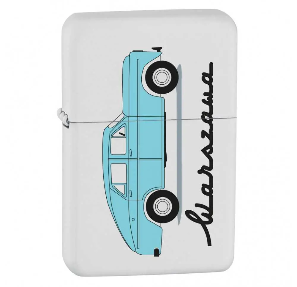 Na białej, gładkiej powierzchni zapalniczki widnieje grafika błękitnej Warszawy z charakterystycznym napisem stylizowanym na retro. Minimalistyczny, a zarazem pełen uroku projekt nawiązuje do złotej ery PRL, kiedy ten samochód był synonimem prestiżu. Estetyka zapalniczki sprawia, że to nie tylko praktyczne akcesorium, ale też małe dzieło sztuki użytkowej.