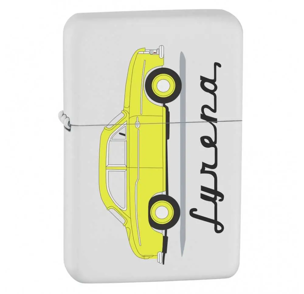 Na gładkiej, białej powierzchni zapalniczki umieszczono grafikę kultowej żółtej Syrenki z charakterystycznym, stylizowanym napisem. Całość utrzymana jest w minimalistycznej, nostalgicznej estetyce, dzięki której zapalniczka idealnie oddaje klimat dawnych lat. To produkt, który łączy prostotę formy z emocjonalnym ładunkiem wspomnień o motoryzacyjnych ikonach PRL.