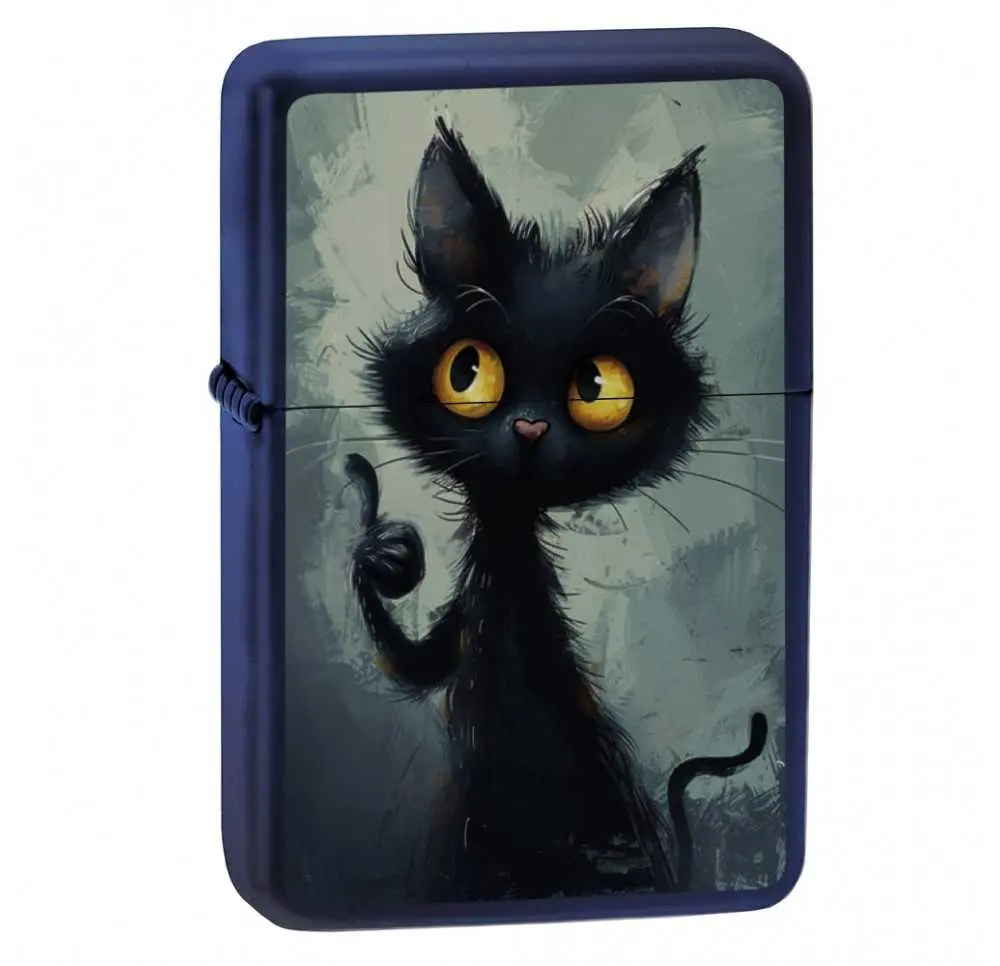 Na przodzie zapalniczki znajduje się grafika czarnego kota o dużych, hipnotyzujących oczach, utrzymana w nastrojowej, malarskiej stylistyce. Całość spowita jest chłodnym, niebieskawym tłem, co potęguje efekt tajemnicy i kontrastuje z intensywnym spojrzeniem zwierzęcia. To zapalniczka, która emanuje charakterem i subtelnym humorem, zachowując elegancję i artystyczny styl.