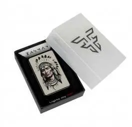 Na przodzie zapalniczki widnieje realistyczne przedstawienie indiańskiego wodza w tradycyjnym pióropuszu, symbolizującym odwagę i duchową moc. Utrzymana w odcieniach beżu, czerni i brązu grafika ma klasyczny, niemal rzeźbiarski charakter, co nadaje jej elegancki i ponadczasowy wygląd. Ten model z pewnością przypadnie do gustu osobom, które cenią historię, symbolikę i sztukę.