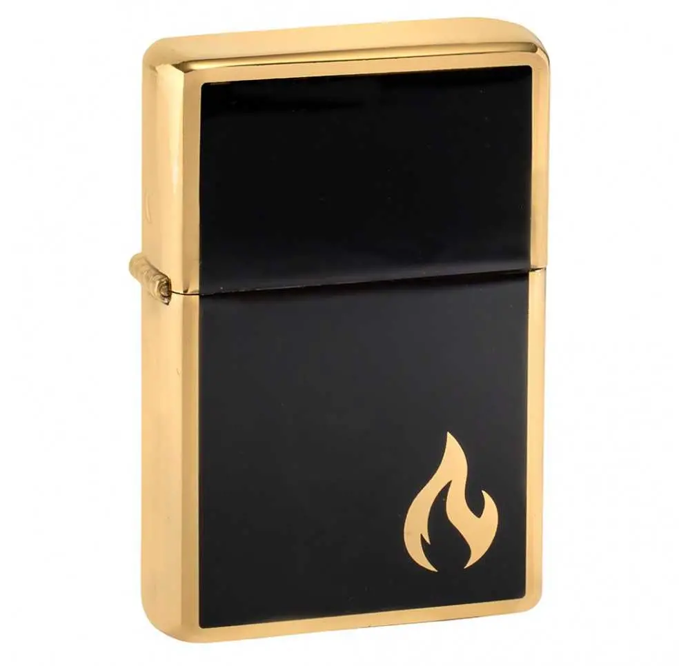 Złote ramki i matowa, czarna powierzchnia tworzą doskonałą równowagę między subtelnością a luksusem. Grawerowany płomień w dolnej części dodaje jej symbolicznego znaczenia – to motyw kojarzący się z siłą życia, namiętnością i determinacją. Zapalniczka prezentuje się niezwykle szlachetnie zarówno w dłoni, jak i w ekskluzywnym pudełku z kolekcji Brass Collection.
