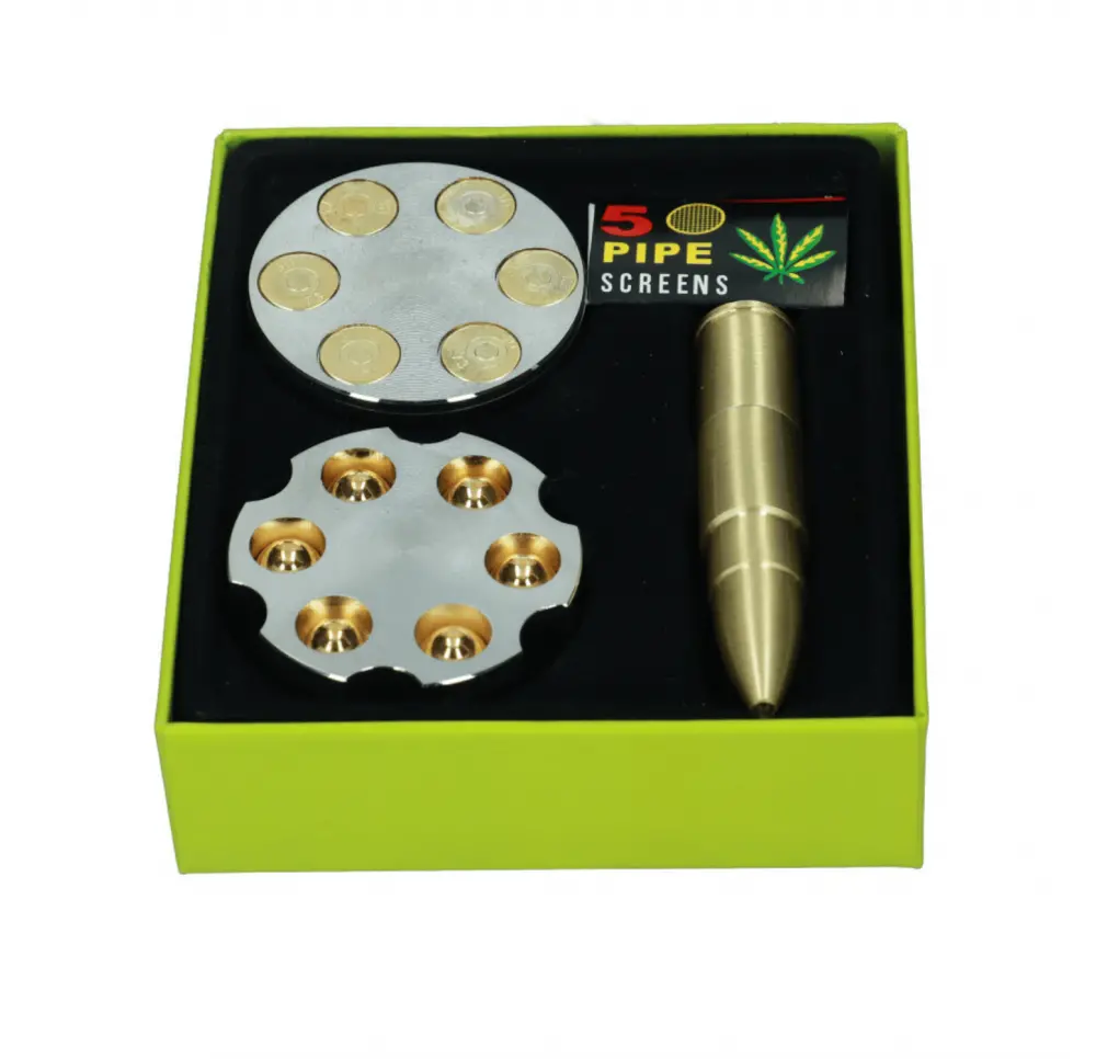W zestawie znajduje się solidnie wykonana lufka w kształcie naboju, która od razu zwraca uwagę swoim wyglądem. Jej metalowa konstrukcja sprawia, że jest wytrzymała i odporna na uszkodzenia, a kompaktowe wymiary czynią ją wygodną w użyciu i prostą w przechowywaniu. To praktyczny gadżet, który jednocześnie prezentuje się niezwykle efektownie.