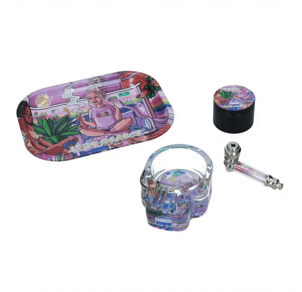 Ten kolorowy zestaw to idealna propozycja dla osób ceniących funkcjonalność i wyjątkowy design. W komplecie znajduje się metalowa tacka o wymiarach 18x14 cm, a także niezbędne akcesoria do przygotowywania i wygodnego korzystania z suszu. Całość utrzymana jest w spójnym, barwnym motywie graficznym, który nadaje produktowi charakteru i wyróżnia go na tle standardowych akcesoriów.